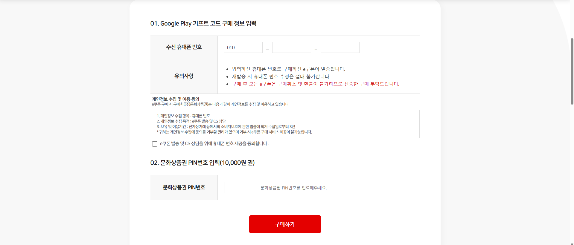 (문화상품권홈페이지 > e쿠폰 > 구매하기 > 원하는 기프트카드 선택 > 구매정보 입력)