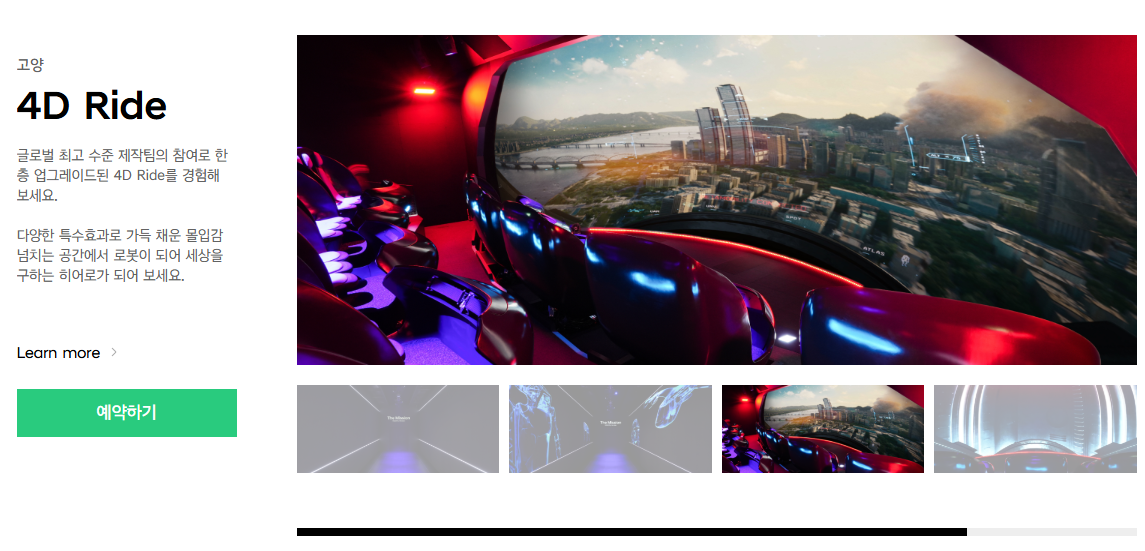 현대 모터스튜디오 고양의 대표 콘텐츠인 ‘4D 라이드’는 최근 ‘더 미션, 모빌리티 히어로즈’라는 주제로 리뉴얼되었습니다. 이 프로그램은 로보틱스 등 현대자동차의 미래 모빌리티를 체험할 수 있는 콘텐츠로, 모션 기체에 탑승하여 다양한 모빌리티와 함께 재난 상황에서 인류와 동물을 구조하는 스토리를 제공합니다. 초대형 돔형 LED 스크린, 6축 모션 플랫폼, 열, 바람, 물, 향, 연기 등 다채로운 4D 특수 효과를 활용하여 차별화된 몰입감을 제공합니다.
